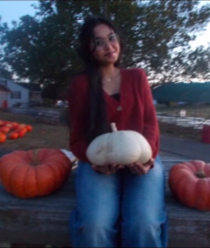 Krupa Patel, a sophomore, has a style that leans into warmth and comfort, but with a more refined style. She loves pairing different types of jeans, especially baggy or distressed, with soft sweaters and layered jackets. Plaid jackets are one of her go-to pieces this time of year, and on more laid-back days, she is all about matching sweat sets. She also gravitates toward warm fall tones, like creamy beige, chocolate brown, and olive green.
